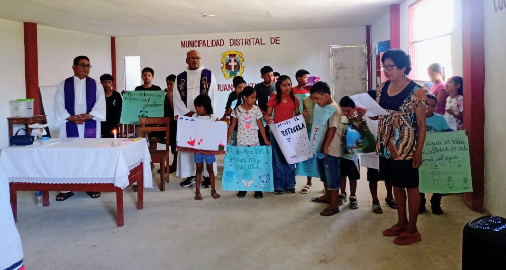 La comunidad del Nuevo Milagro no esperó que el agua viniera a ellos, fueron hacia ella. En una fecha organizada por las hermanas de la Compañía de María, primero se reunieron como familia, alrededor del altar, para celebrar la eucaristía y dar gracias a Dios por ese don tan sencillo y tan enorme que es el agua. Ese líquido que corre por las venas de la selva, que sostiene la vida de los peces, de las personas y que lamentablemente va desapareciendo poco a poco. La misa fue un momento de pausa y de gratitud, un recordatorio de que, es bueno detenerse y agradecer.
